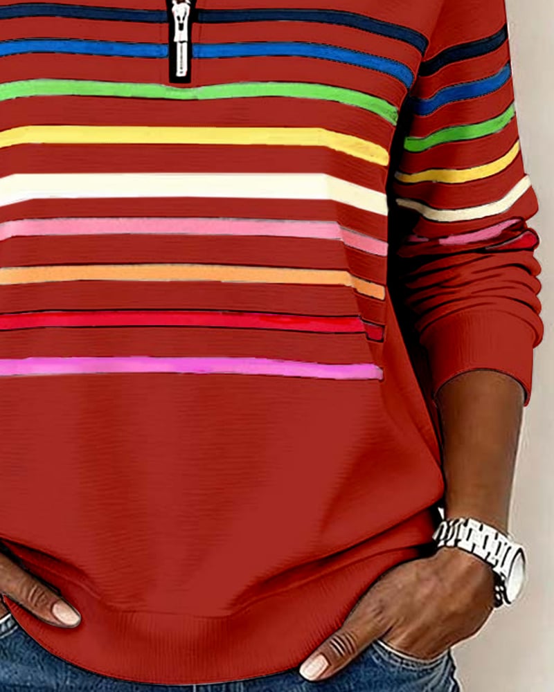 Half-Zip Collar Fashionable Rainbow Striped Sweatshirt